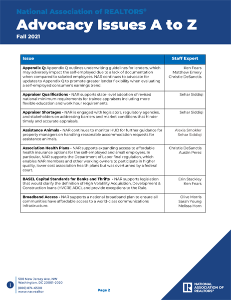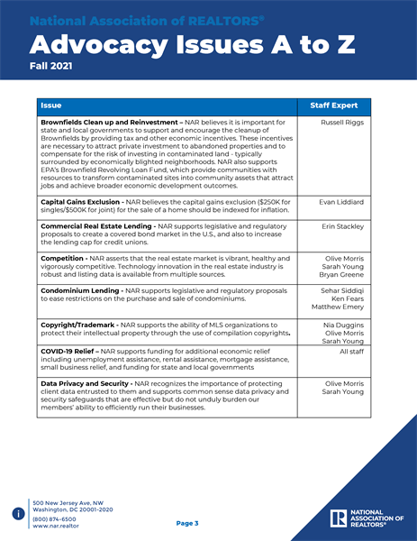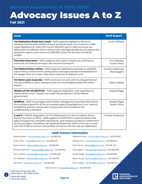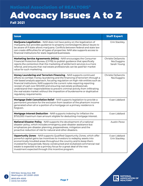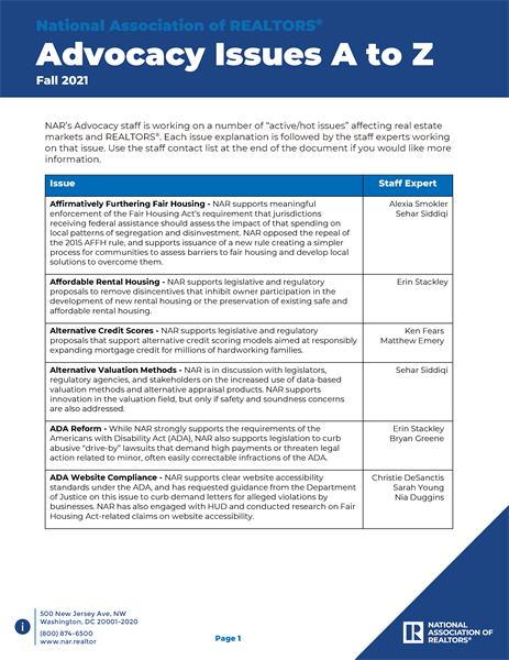 NAR’s Advocacy staff is working on a number of “active/hot issues” affecting real estate markets and REALTORS®.