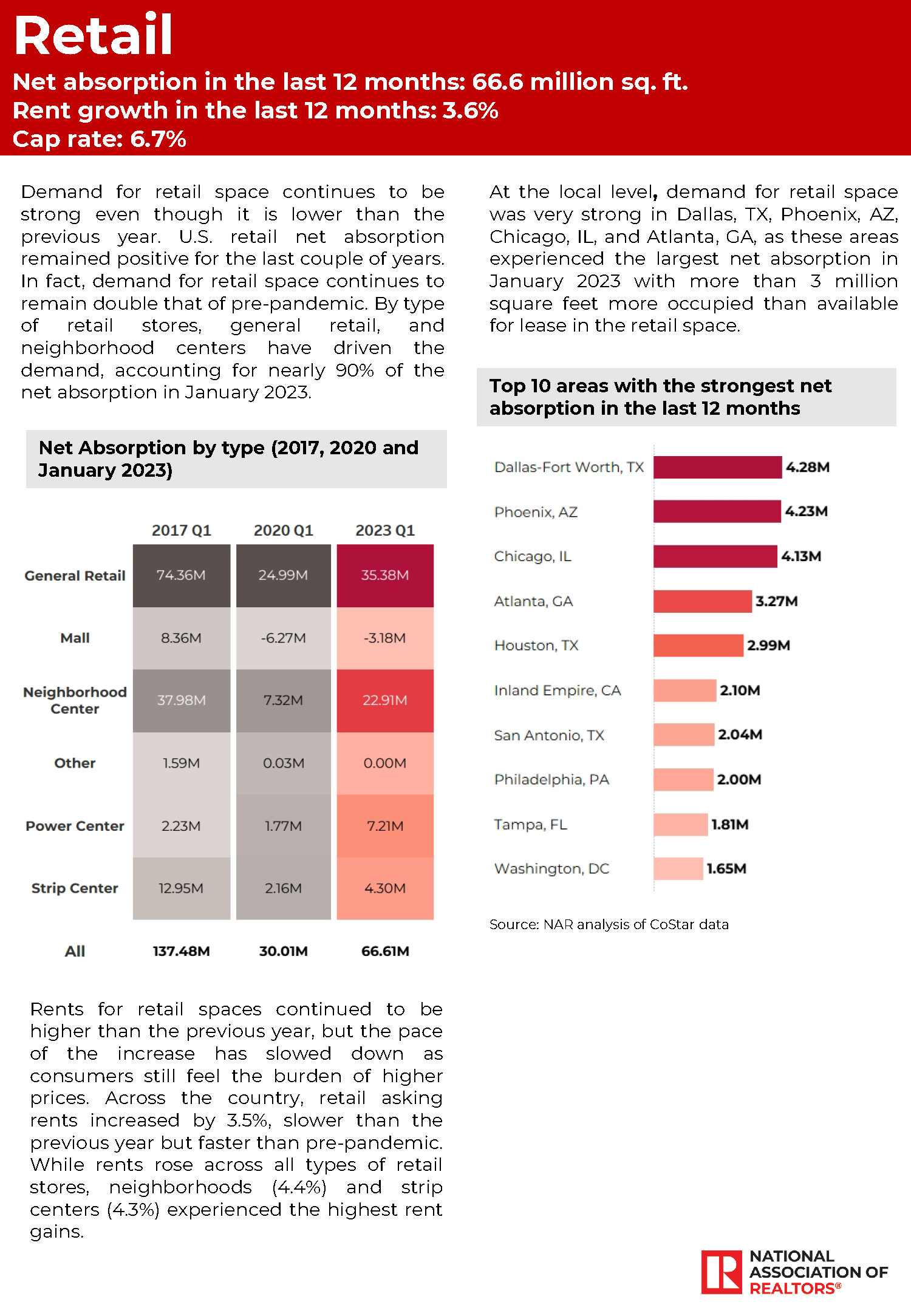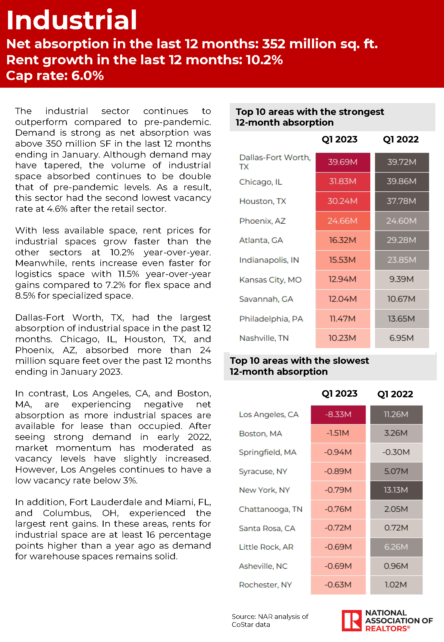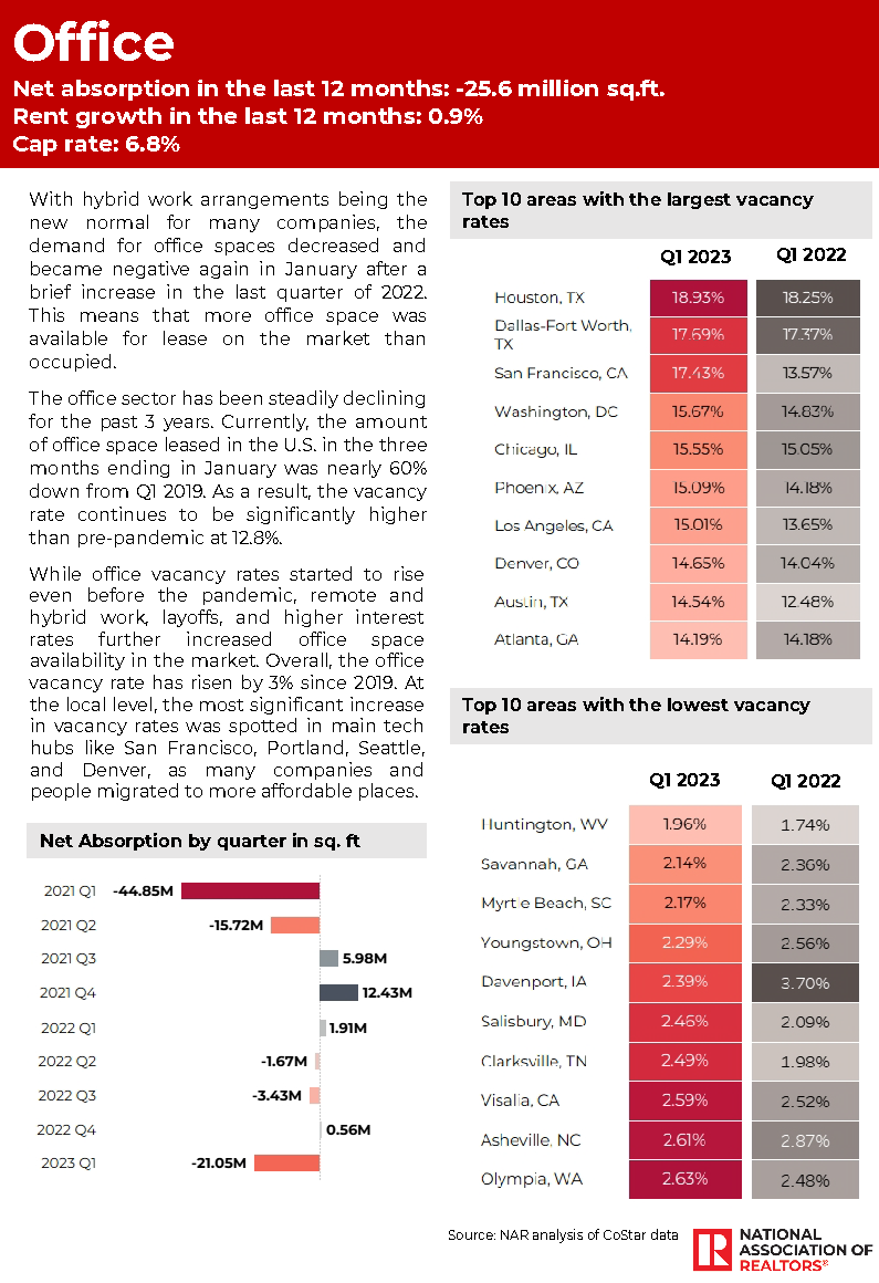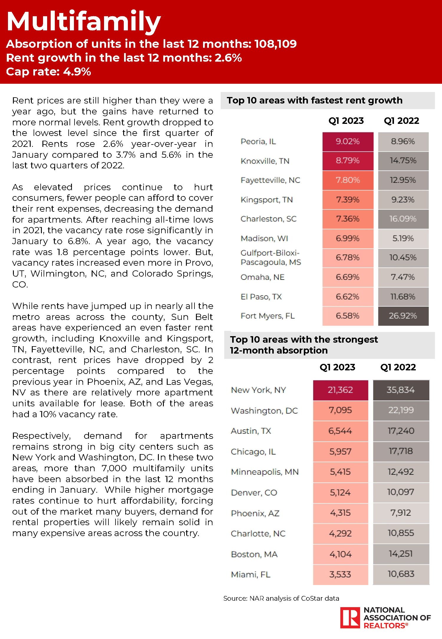 Commercial real estate started the new year on a slow note with lower demand, smaller rent price gains, and higher vacancy rates. Office and multifamily are the two sectors that face additional headwinds this year. In these two sectors, vacancy rates are more than 0.8 percentage points higher than a year ago. Net absorption – another indicator of demand – was significantly lower in January compared to a year ago in all four main sectors of Commercial Real Estate. In fact, office space net absorption went back to negative territory. This means that more office space was vacated/available in the market than what was leased or absorbed by commercial tenants.