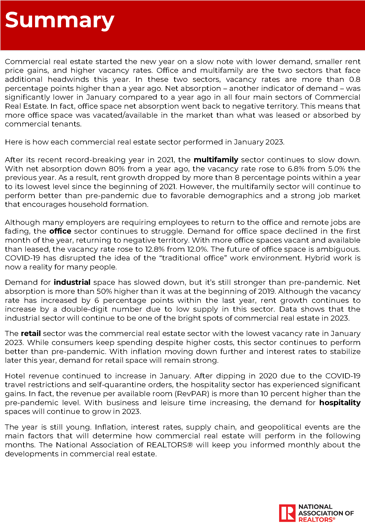 The year is still young. Inflation, interest rates, supply chain, and geopolitical events are the main factors that will determine how commercial real estate will perform in the following months.
