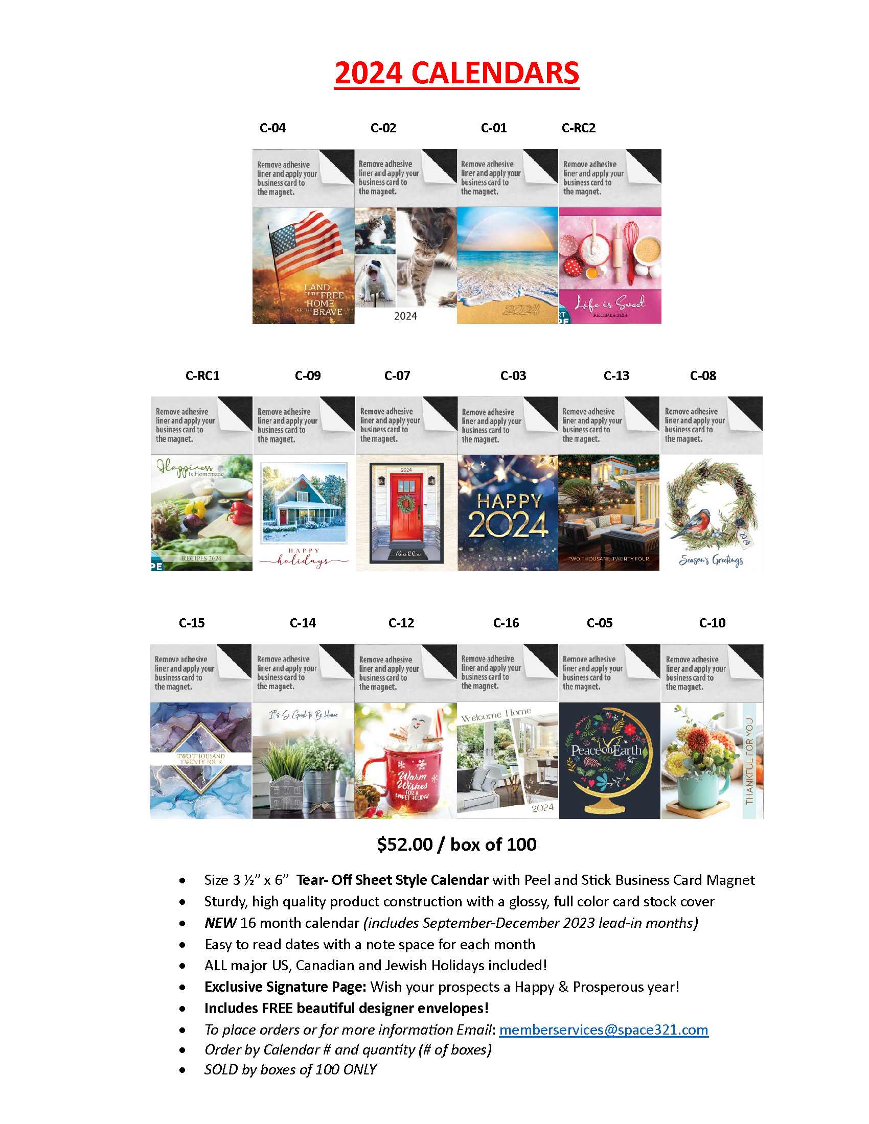 We are excited to announce that the 2024 Holiday Calendars are now available for purchase. Each box contains 100 calendars and is priced at $52.00.