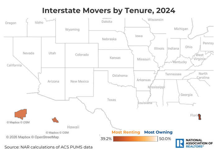 For REALTORS®, this is critical. Interstate movers are not a single group, and their housing choices depend significantly on where they move. In some markets, movers represent future buyers. In others, they are buyers right away. Even after major market shifts, from the housing crash to the pandemic surge, interstate movers have consistently hovered around the same level over time. What changes is where those buyers show up. Understanding how people move and how they choose to live when they get there provides a clearer picture of local housing demand.