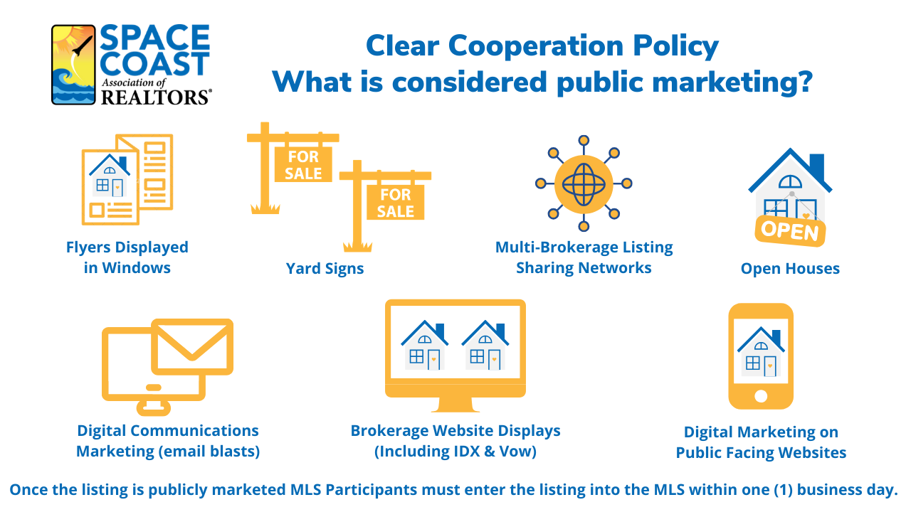 Note: Exclusive listing information for required property types must be filed and distributed to other MLS Participants for cooperation under the Clear Cooperation Policy. This applies to listings filed under Section 1 and listings exempt from distribution under Section 1.3 of the NAR model MLS rules if it is being publicly marketed, and any other situation where the listing broker is publicly marketing an exclusive listing that is required to be filed with the service and is not currently available to other MLS Participants.