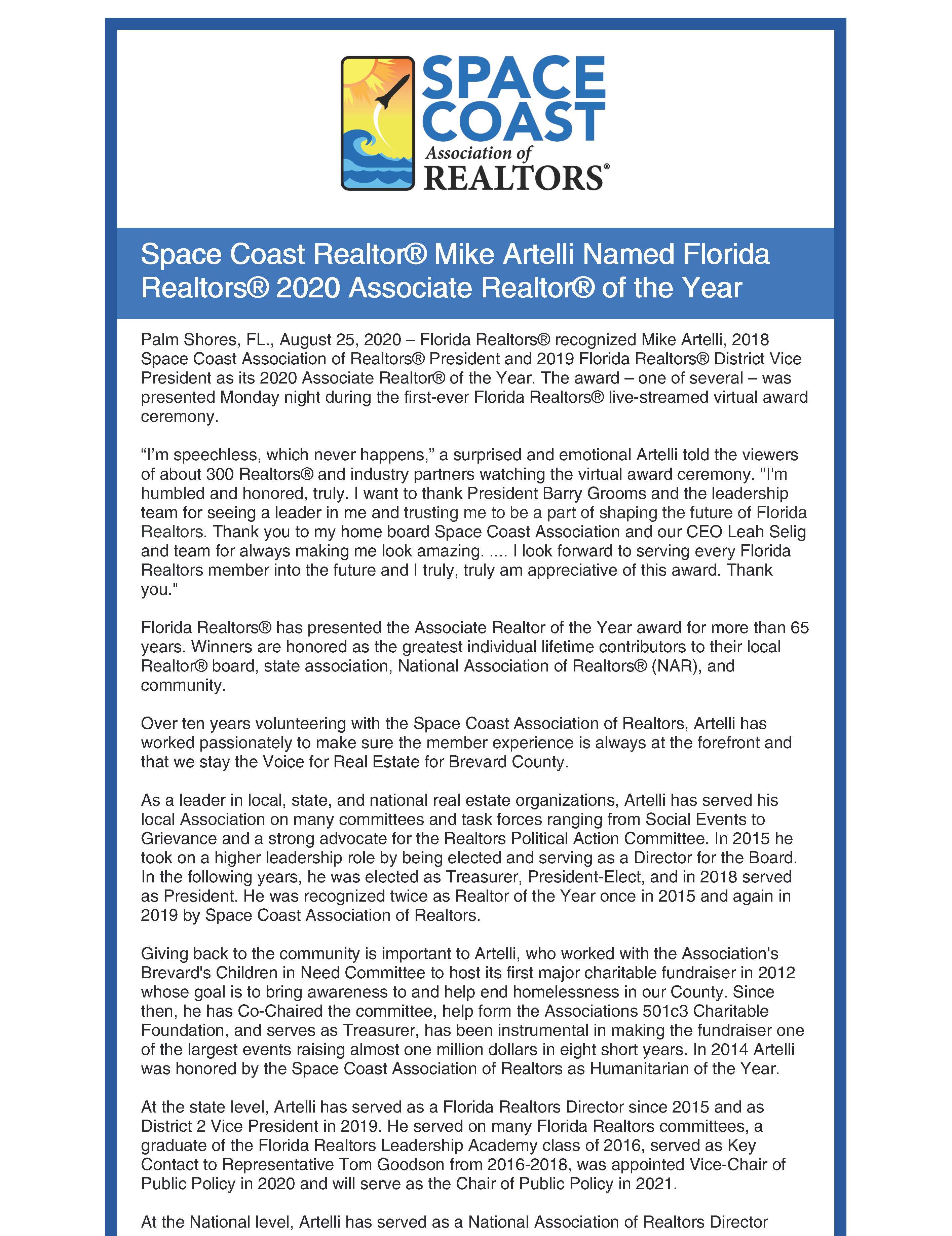 Space Coast Realtor Mike Artelli Named Florida Realtors 2020 Associate Realtor of the Year