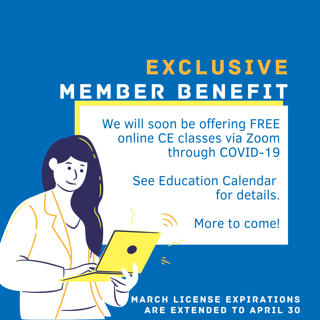 We are offering FREE online CE classes via Zoom through COVID-19, available through our Education Calendar and the Webinar Page.
