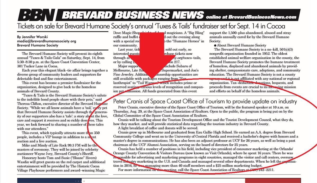 Our press release announcing Peter Cranis to speak at our Tourism Update will be published on page 17 of the August 26th release of Volume 37 No. 34 of Brevard Business News!