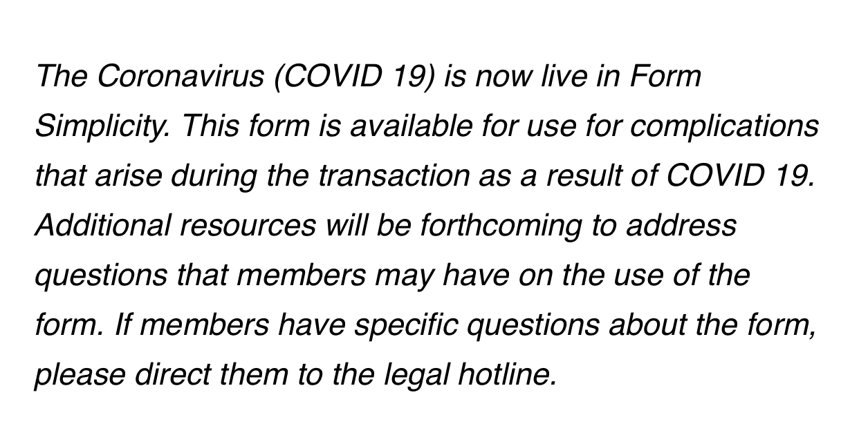 If you are using Form Simplicity, please note: COVID-19 extension addendum has been added to the contract. Contact the legal hotline with questions. We will continue to post any updates.